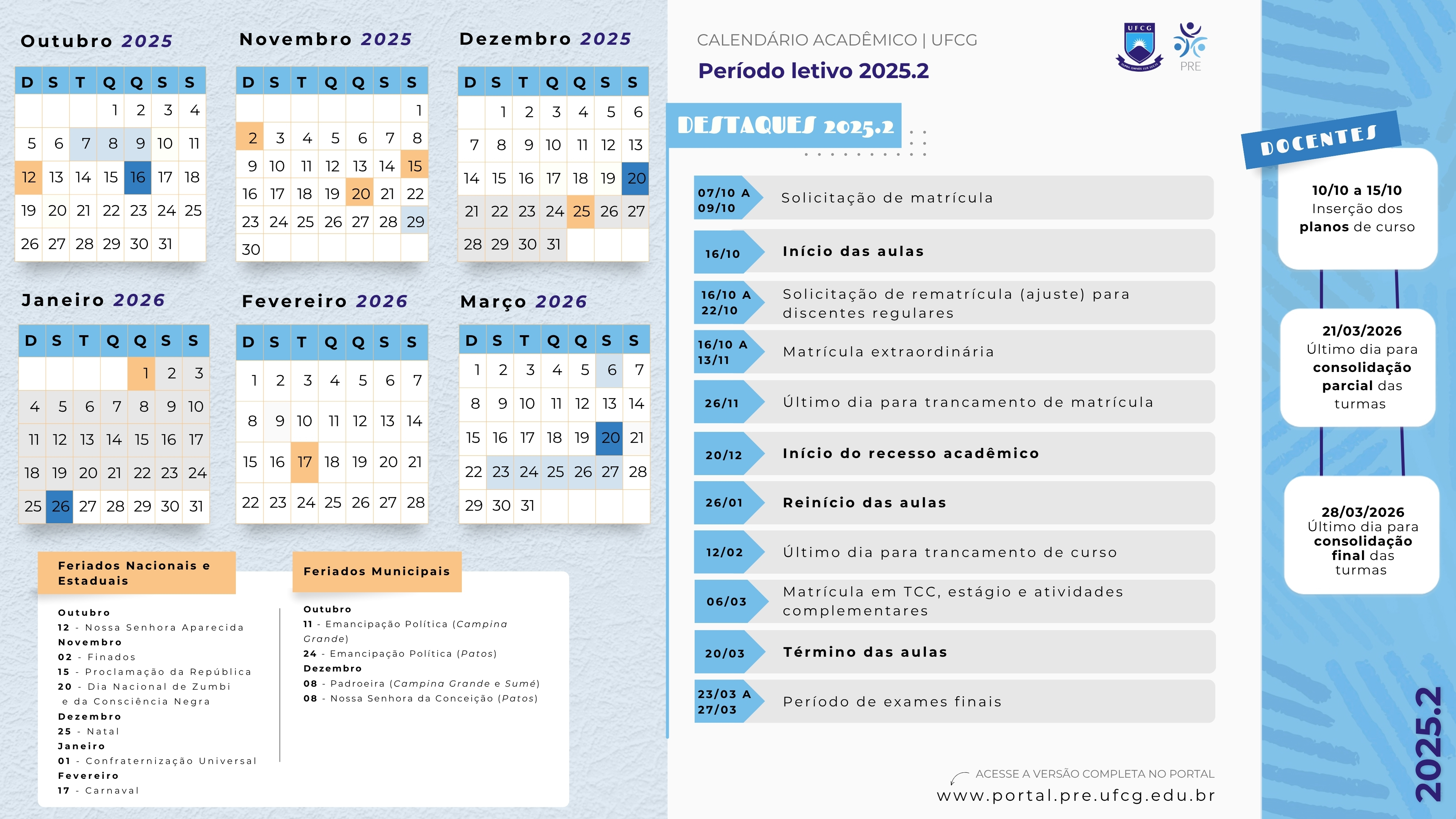 Veja abaixo o calendário do período 2025.2 na UFCG.